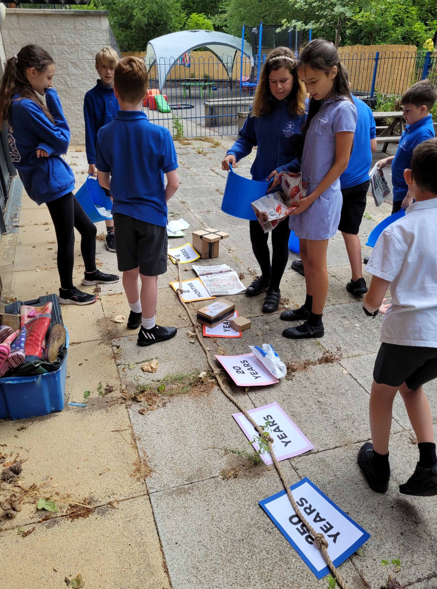The two classes took it in turns to have a go at our decomposition timeline activity. Splitting into five groups, the teams of children had to try and guess how long each item of rubbish, in their buckets, would take to break down.