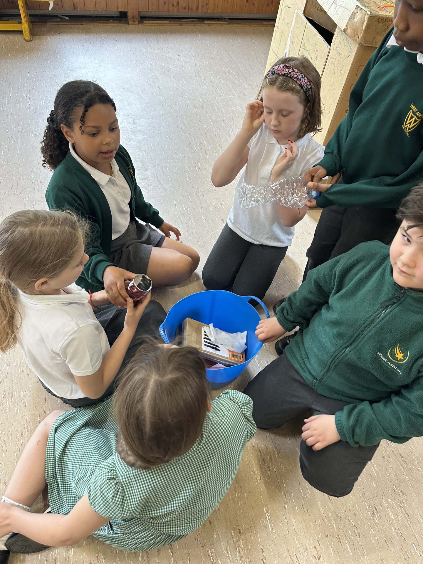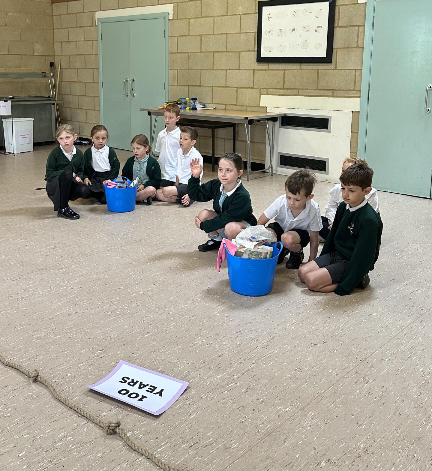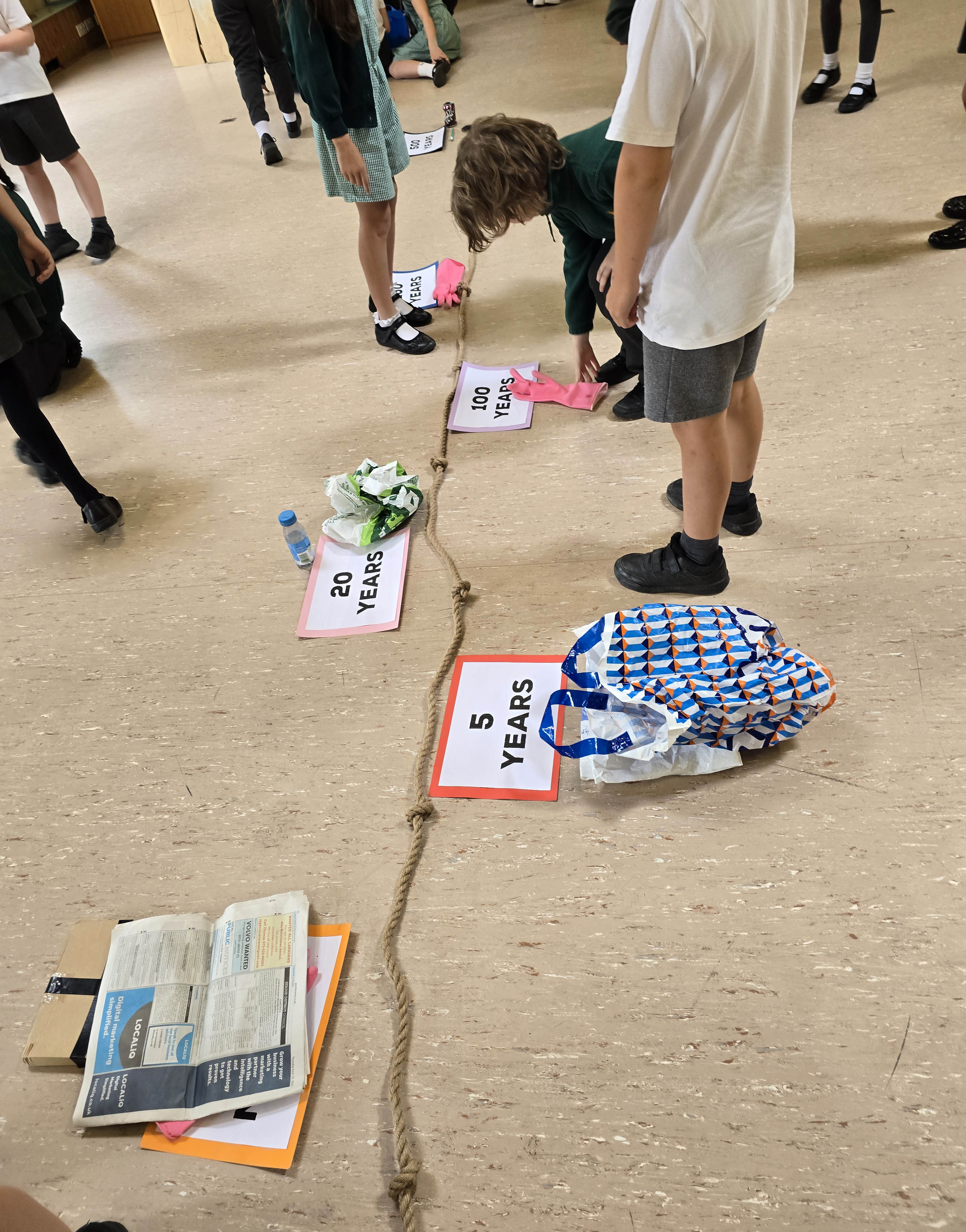 Afterwards, we delved into our interactive plastic decomposition activity with each class. The purpose of this activity is to help the students understand how long it takes for different items to biodegrade in the environment. The children did an excellent job at working in teams to guess-timate the lifetime of each item. In fact, they were our 2nd ever school to get the life of a wet wipe correct!