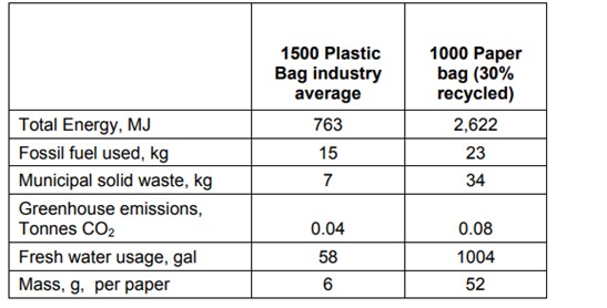 A common misconception is that paper bags are better for the environment. However, a life-cycle assessment has shown that the production of paper bags requires more resources than plastic bags. In a study of the production of 1000 paper bags vs 1500 plastic bags, a higher volume of energy, fossil fuels, water and solid mass was required to produce fewer paper bags than plastic – shown below (Greene, 2011).